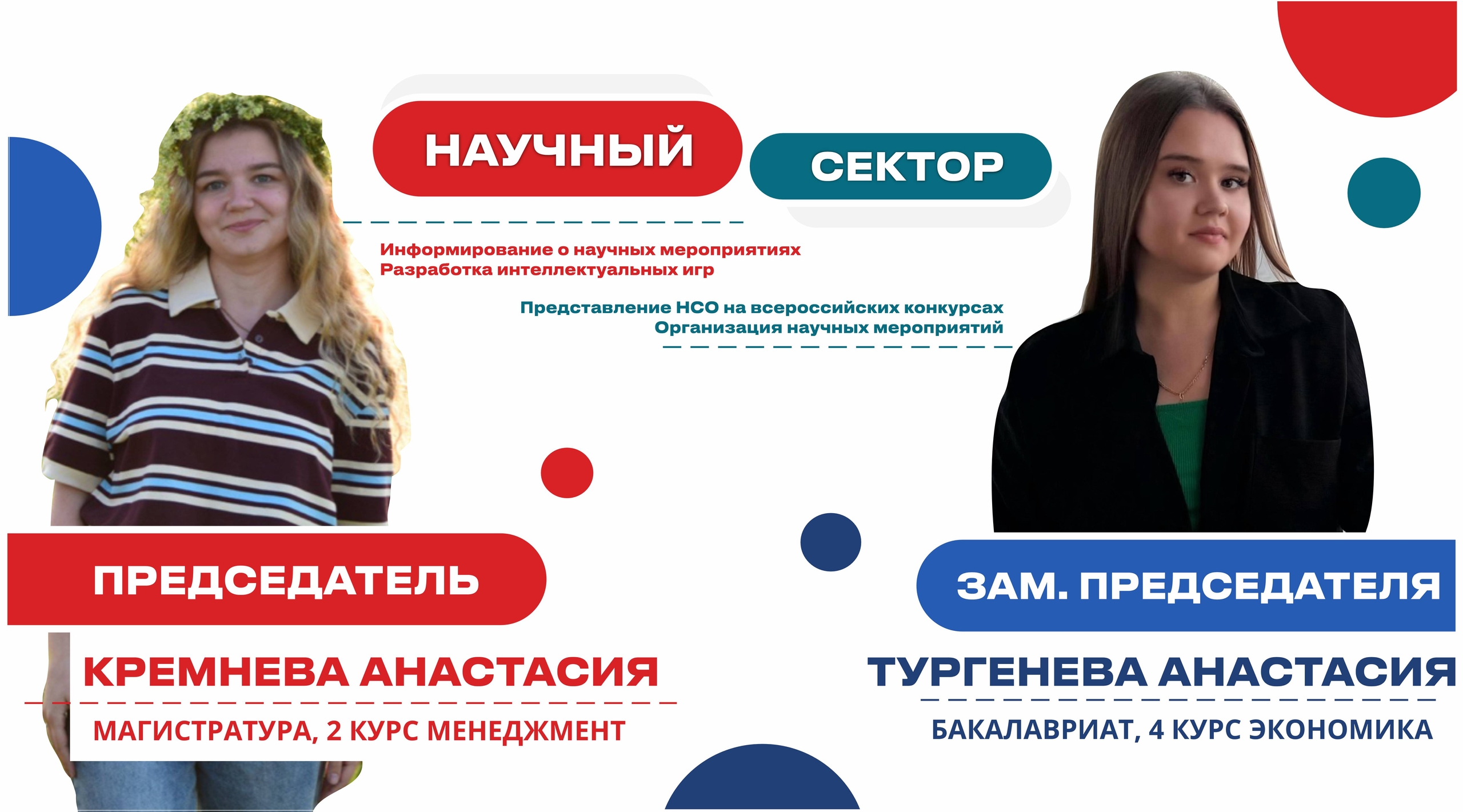 Кремнева Анастасия — председатель научного студенческого сектора. В её обязанности входит информирование и участие в научных мероприятиях.