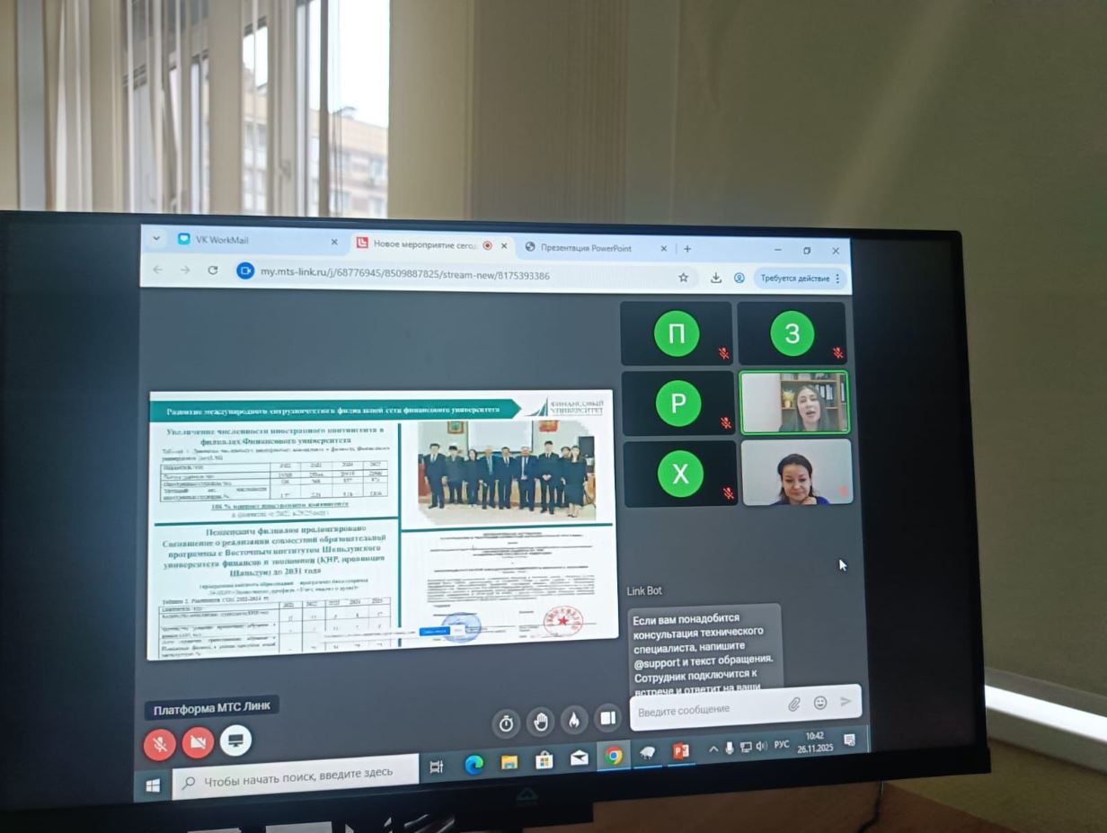 26 ноября в рамках X Международного форума Финансового университета «Россия: образ будущего» заведующий учебной частью, старший преподаватель кафедры «Менеджмент, информатика и общегуманитарные науки» Ксения Сергеевна Таишева от лица директора филиала, доктора экономических наук, профессора Владимира Викторовича Бондаренко приняла участие в круглом столе «Международный диалог в сфере образования: от настоящего к будущему». Круглый стол, посвященный актуальным направлениям международного сотрудничества в сфере образования в области цифровой трансформации и продвижения русского языка в мире, проводился Подготовительным факультетом Финансового университета при Правительстве Российской Федерации.