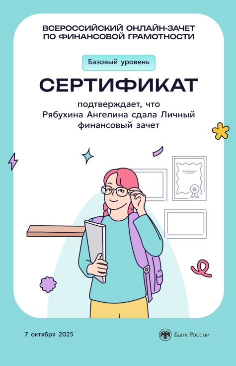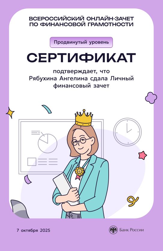 Данная образовательная акция дала возможность участникам проверить свои экономические знания, получить полезные рекомендации в сфере личных и семейных финансов, пополнить коллекцию индивидуальных достижений. Каждый участник, успешно завершивший зачет, получил именной сертификат с личными результатами по достигнутому уровню финансовой грамотности.
